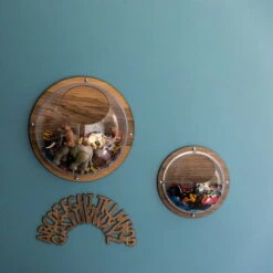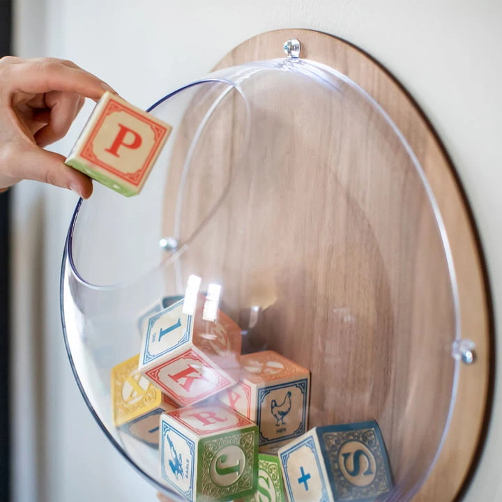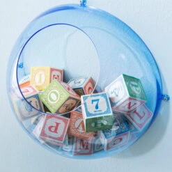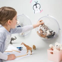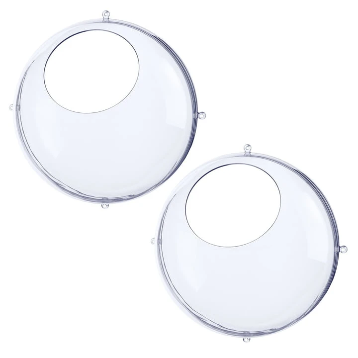 Wall display Orion is a decorative storage for any ambience. The transparent thermoplastic hemispheres are simply screwed to the wall at the desired position. Orion can be easily filled with all kinds of objects through a large handle opening. In the kitchen fruit can be stored in it, in the hallway caps and gloves can be stored and in the children’s room lots of toys can be stored. This makes tidying up easy and everything is in its place.