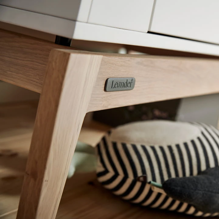 The floating design of the wardrobe with angled lines and a visual separation of the body and legs fits perfectly with the rest of the Leander Luna Series and gives the children’s room a light and modern atmosphere.