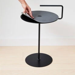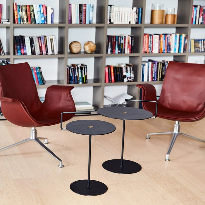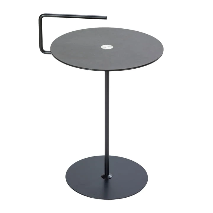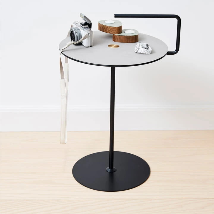 The LindDNA pick-up side table convinces with its modern design and its shape was inspired by the classic turntable. The table consists of a base with a round base made of powder-coated steel. The double-sided round tabletop is covered with recycled leather. Since the leather mat has different colours on each side, the look of the table can be easily changed. The table adapts perfectly to any ambience. Practical is the handle with which the table can be carried easily. This means that Pick-Up is ready for use anywhere at any time.