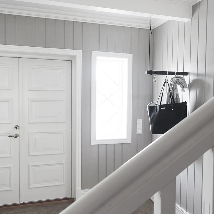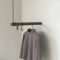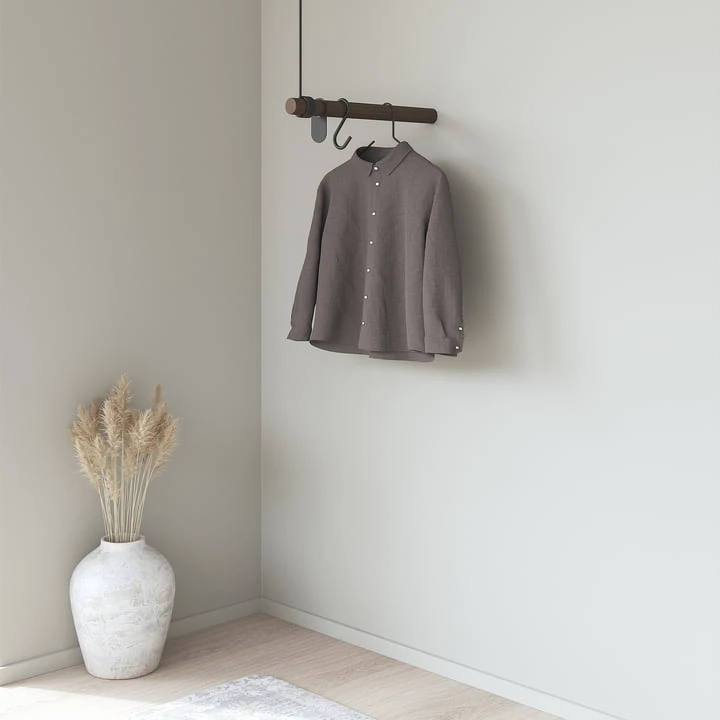 The Wall Swing wall coat rack from LindDNA is an elegant handmade coat rack made of oak wood and recycled leather. The 50 cm long oak rod offers enough space for jackets and coats and is attached to the wall and at the same time with a thick leather strap to the ceiling.