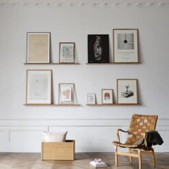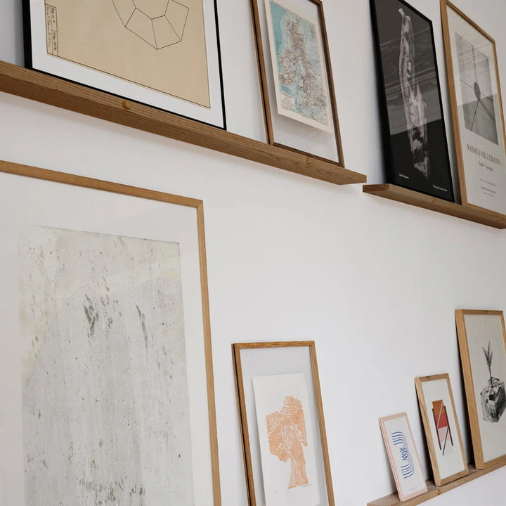 The Gallery Shelf from Moebe convinces with its simplicity. Made of solid oak, the wall shelf offers enough space for picture frames and posters thanks to its front groove. The free, smooth area at the back of the shelf can be used wonderfully for books, vases and other decorative elements. The Gallery Shelf can be arranged individually or in combination with other wall ornaments to create – as the name also suggests – a gallery wall of photos and posters in the living room or children’s room.