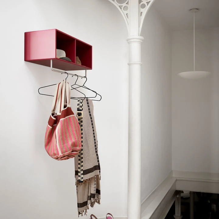 The Coat wardrobe by Montana is a practical shelf with a clothes rail designed by Peter J. Lassen. The wardrobe is perfect for the entrance area and hallway. Coat consists of a shelf with two compartments under which a clothes rail is fixed. It is suitable for hanging jackets and coats and the compartments offer space for hats, scarves and the like.