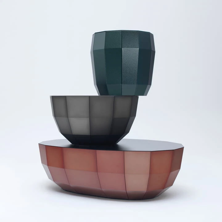 The MO Coffee table by Müller Möbelfabrikation was designed by Werksdesign and convinces by its extraordinary geometrical form. This flexible piece of furniture is part of a series of tables for the living area. The MO Tables consist of a facet-like screwed metal substructure and a 3 mm thick aluminium plate. In order that form and materiality are even better accentuated, the MO Tables exclusively available in special colours and glazes and set their highlights in every home, multifaceted and elegant.
