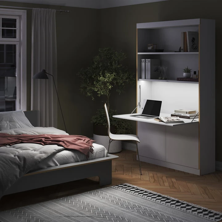 The Flai Home-Office Secretary by the designer duo Kaschkasch for Müller Small Living inspires with its flexibility. Thanks to the push-to-open function, the damped flap holders, the built-in lights, as well as the openings for cable feed-through, working in the home office is directly more pleasant. The compact secretary offers enough space for daily work in the home office. When not in use, the desk can be folded again quite flexibly, so that it acts space-saving.