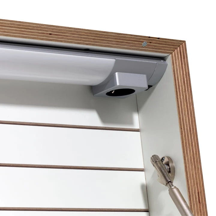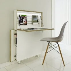 The high-quality equipment of the Flatmate secretary is particularly impressive: In the side flaps of the secretary from the Müller Small Living accessories, folders and a 17” notebook can be stored in the side flaps of the secretary, and even if work lasts until late at night, there is a solution. Flatmate The desk offers a solution: Workplace lighting and a power socket are already integrated.