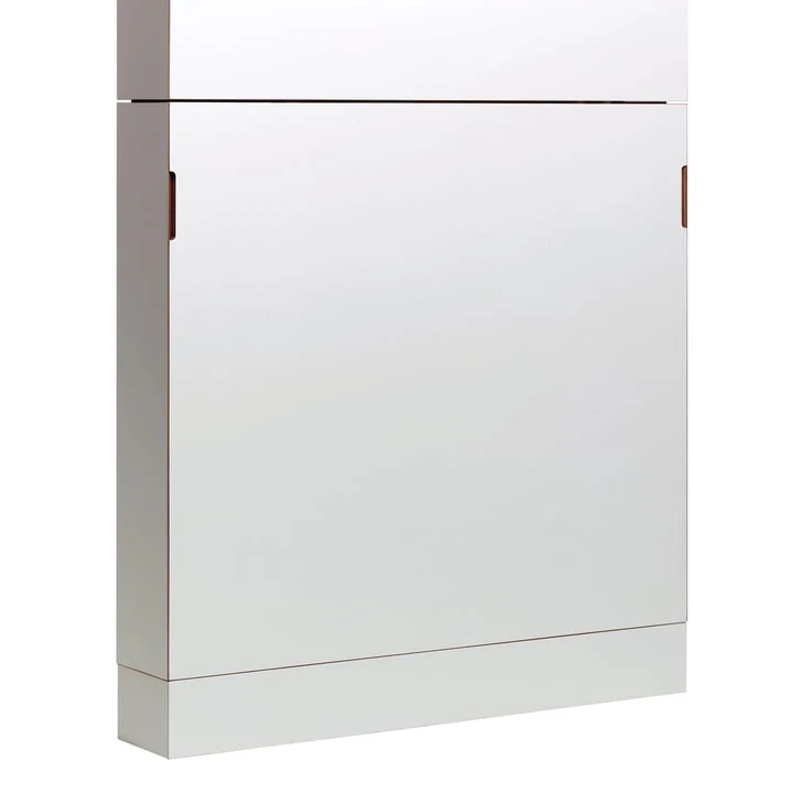 In the upper area, the secretary is secured to the wall with the help of a wedge bar with 2 screws. The wall mounting creates a 10 mm wide shadow gap between the wall and the furniture; i.e. the total depth of the secretary is only 132 mm. It is available in different colors and material finishes.