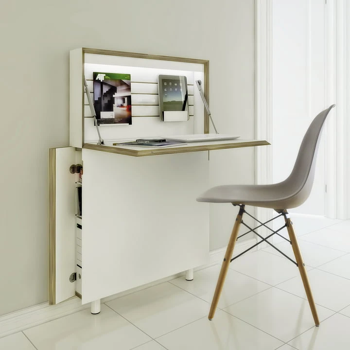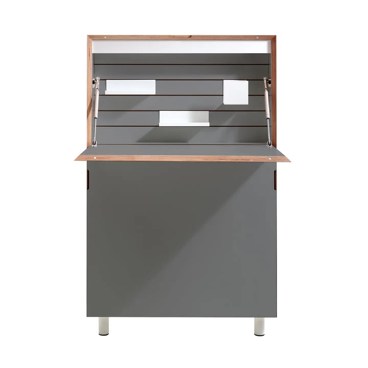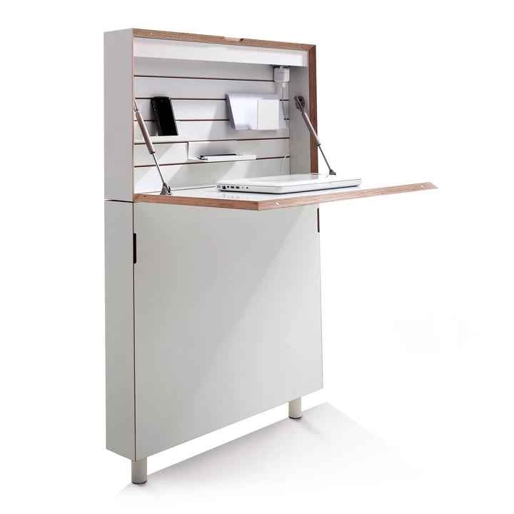 Designer Michael Hilgers has Flatmate has completely reinterpreted the piece of furniture secretary and meets the nerve of the time: The secretary is optimal for everyone who works and lives mobile. Flatmate It fits into any interior design and integrates the demands of networked work and life: Depending on requirements, the Flatmate Depending on requirements, the secretary offers storage options for a classic notebook, a tablet PC and iPad & . Of course, there is also room for classic writing utensils.