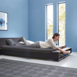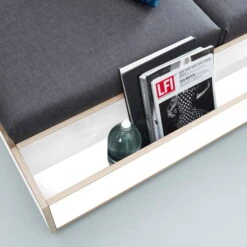 The Maude bed frame from Müller Small Living is a classic bed designed to meet modern requirements. It is designed by Swiss architect Michael Mettler, who has added practical features to the benefits of a cosy and stylish bed: The sleek and space-saving bed has compartments at the foot and head ends to store books and more. A special highlight is the headrest, which consists of two parts. Depending on your needs, it can also be hooked into the compartments at opposite ends to turn the bed into a sofa bed, a sofa bed or a sofa bed. Maude bed as a sofa bed, as a couch, or for working on a laptop.