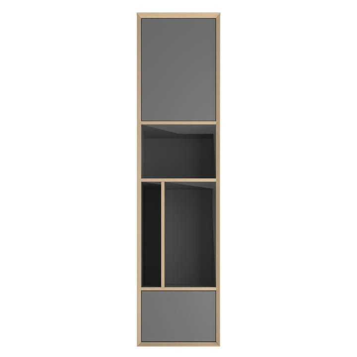 The Vertiko Vertical Shelf is made of coated birch wood and is available in various finishes and colors.