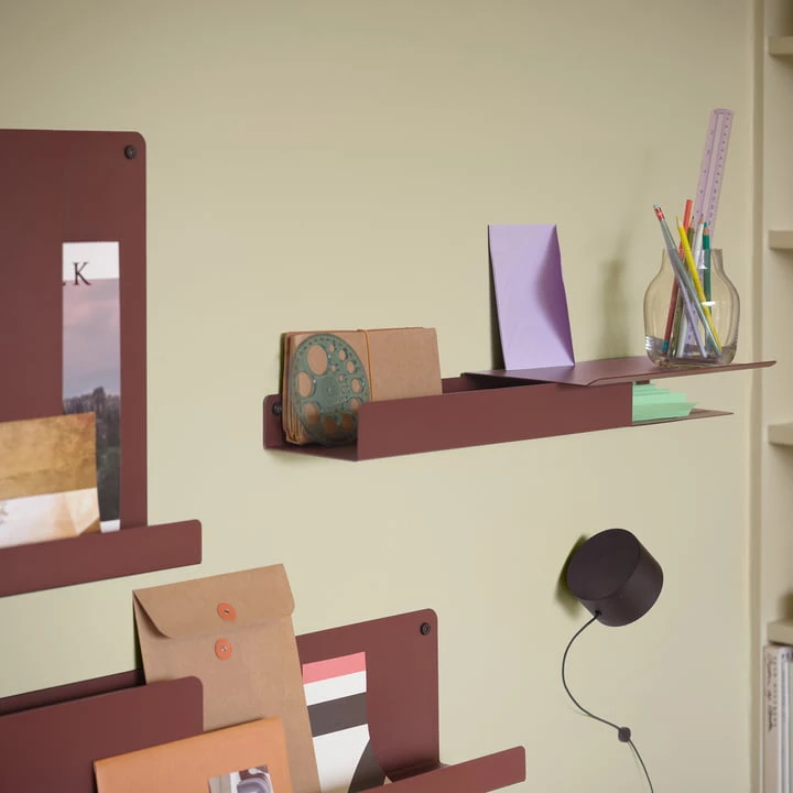 Folded Shelves from Muuto , imitating the look of folded paper but formed of metal, have a modern, functional character. The shelves come with two hooks and two screws to attach them to the wall. Folded Shelves are a modern and friendly way to create storage space in any home or office.