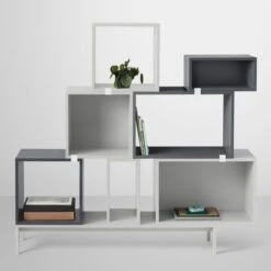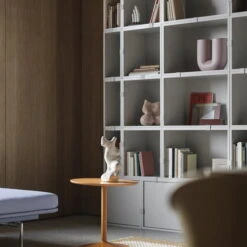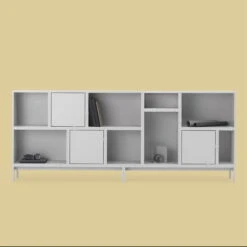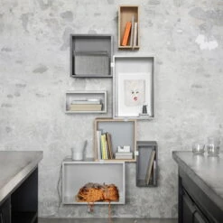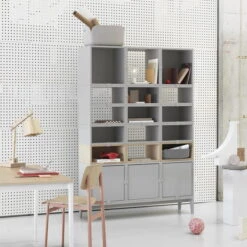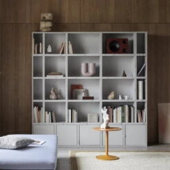 The modules of the Stacked shelving system in the light grey version from Muuto are available with or without back panels. In addition, there is a Stacked series comes with a podium, which can be used to elevate the individual Stacked components can be raised, for example to create a sideboard.