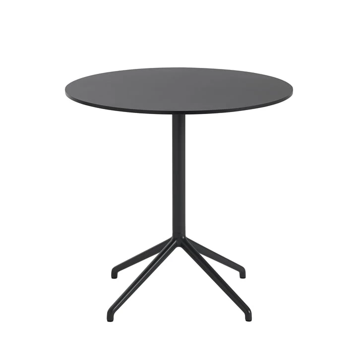 The round, laminated tabletop is enthroned on a powder-coated steel base. The base is a four-legged foot with angled edges. The combination of round shapes and defined lines makes the Still Café table a stylish piece of furniture suitable for any ambience.