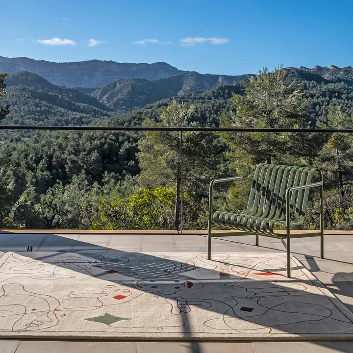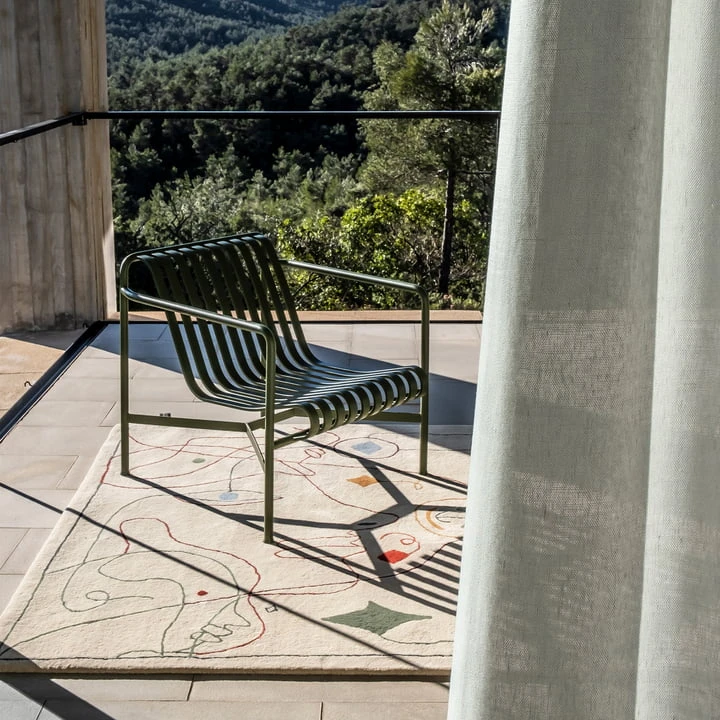 The carpet is suitable for indoor and outdoor use, is made of recycled PET and is available in different sizes. The carpet is therefore not only robust and weatherproof, but also environmentally friendly and sustainably produced. The handmade kilim with embroidery is made in Pakistan. The chain stitch embroidery texture gives the carpet a soft volume, which underlines the graphic illustrations. Despite the fine embroideries, the technique is very robust, making the outdoor carpet suitable for both private and commercial use.