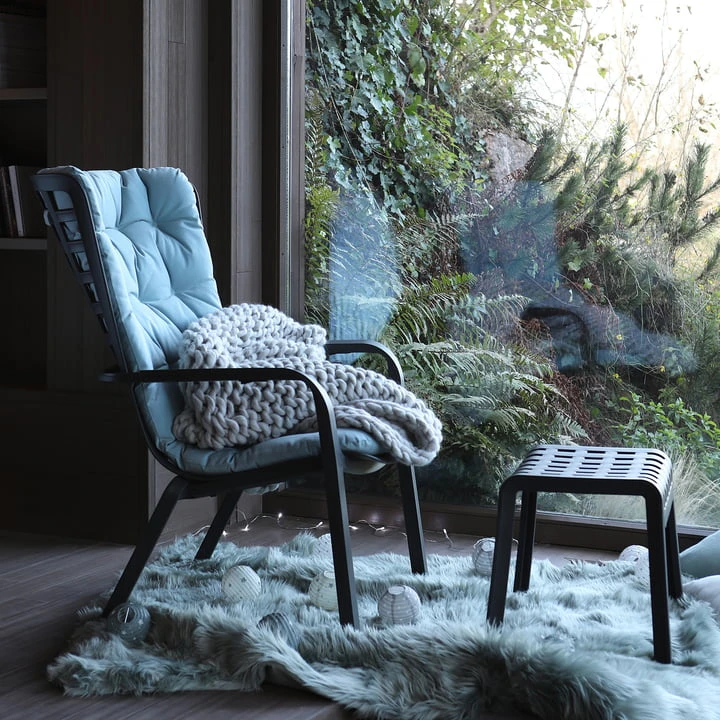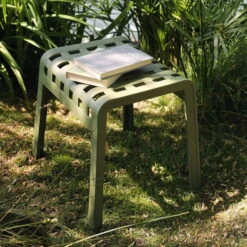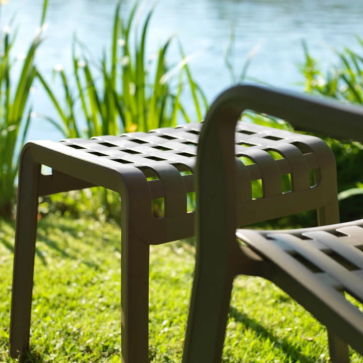 The Poggio stool from Nardi is a footstool and outdoor seating option. Made of fiberglass-reinforced plastic, the stool features a perforated structure decorated with a check pattern that adds an unconventional style to the garden or patio.