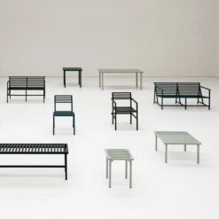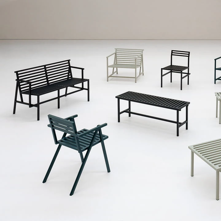 Each item in the series has an individual design. Through the material, color and proportions of aluminum extrusion unify the entire collection. The basis of the ’19 Outdoor’ series is the design project ’19 Chairs’ – 19 chairs were made in 19 days, delivered to 19 locations, reworked by 19 creatives and this was done during the COVID-19 phase. The purpose was to design a response in favor of Age UK & Resourcing Racial Justice, regarding the damage of COVID-19 restrictions within the artist scene.