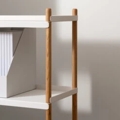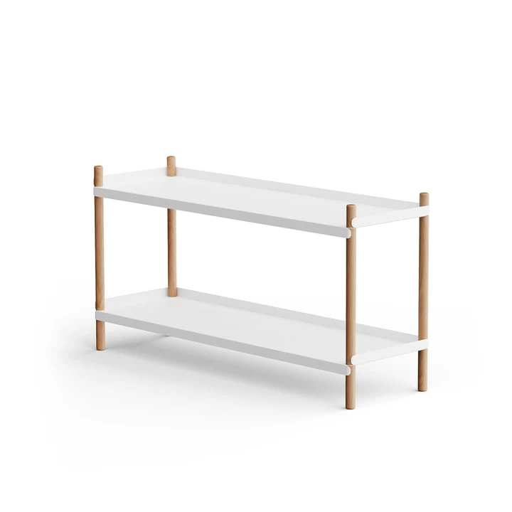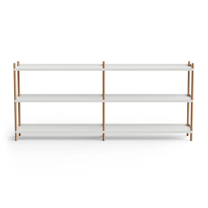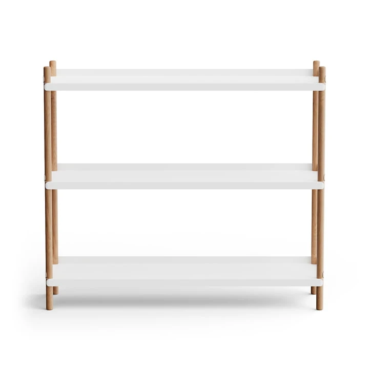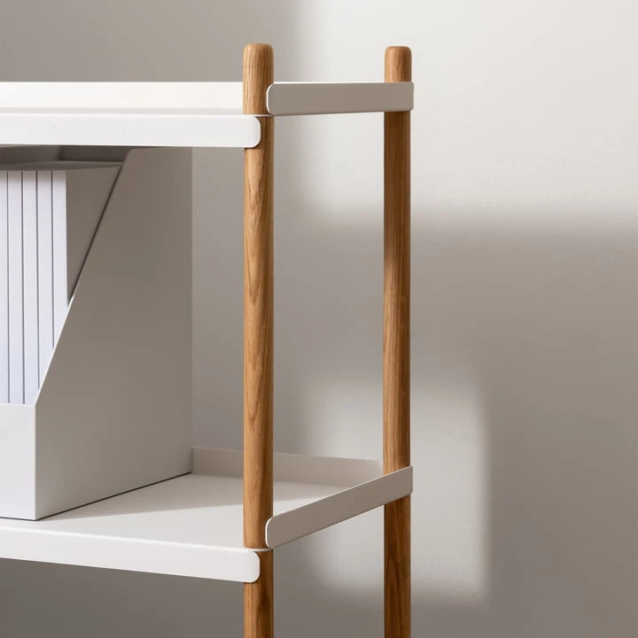 The shelves are folded and wrap around the oak uprights, adding strength and stability to the structure. Screws and threads are embedded in the oak rods, so that BOLT is delivered without additional screws and can be assembled without tools.
