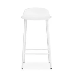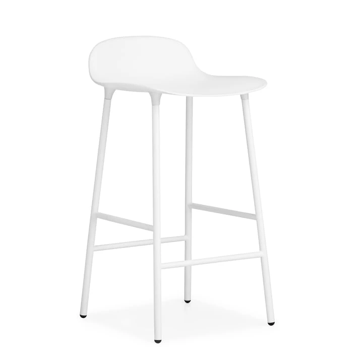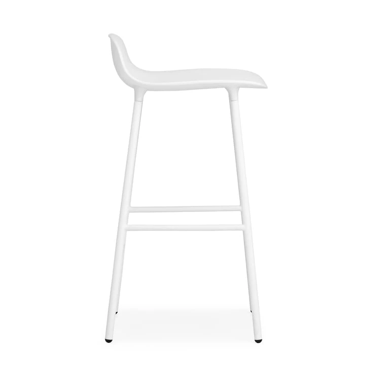Simon Legald wollte mit der Form Serie von Normann Copenhagen Sitzgelegenheiten schaffen, die wie aus einem Guss erscheinen. Dieses Konzept geht besonders bei der Barhocker Version mit Stahlbeinen auf, bei der Sitzfläche und Gestell in derselben Farbe eine besondere Einheit bilden.