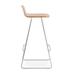 The bar stool with backrest is another interpretation of the Just chair. Both seats convince by the shell made of hard and light veneer, which clearly tapers. A light steel frame with integrated footrest holds the bowl and contributes to the organic overall impression.