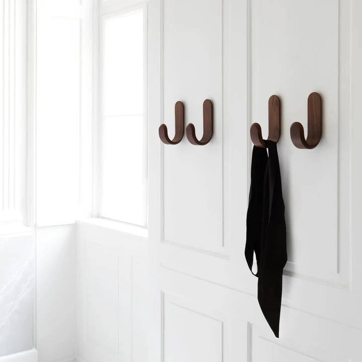 The Curve Coat Hook is crafted from molded wood and available in a Scandinavian-cool color palette. With their Nordic-clear expression, all colors beautify the – often white – walls in the hallway. Even with a single hook can create a graphic accent on the wall, with several in a row or in a particular pattern, the individual impression is perfect.