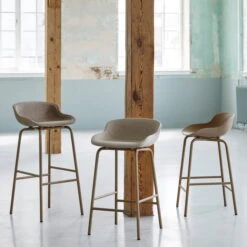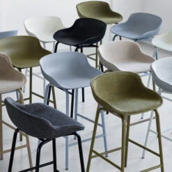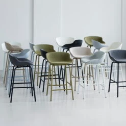 The bar stool consists of a four-legged frame in powder-coated steel or oak and a seat shell in polypropylene. Both parts are painted in the same colour, giving the stool a particularly calm and uniform appearance. Available in different colours and heights, the bar stool fits perfectly into different ambiences, public and private spaces.