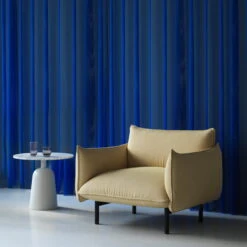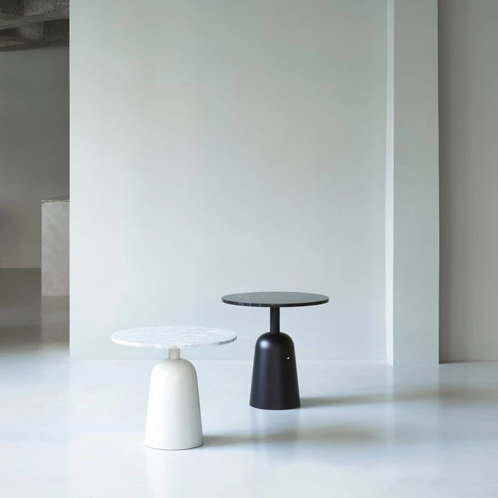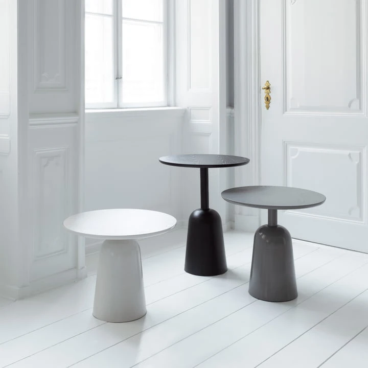 Turn is suitable as a sofa or side table and can be placed solo or in a group of small tables in the living room or lounge area. The oak veneer table top is painted in the same color as the steel base.