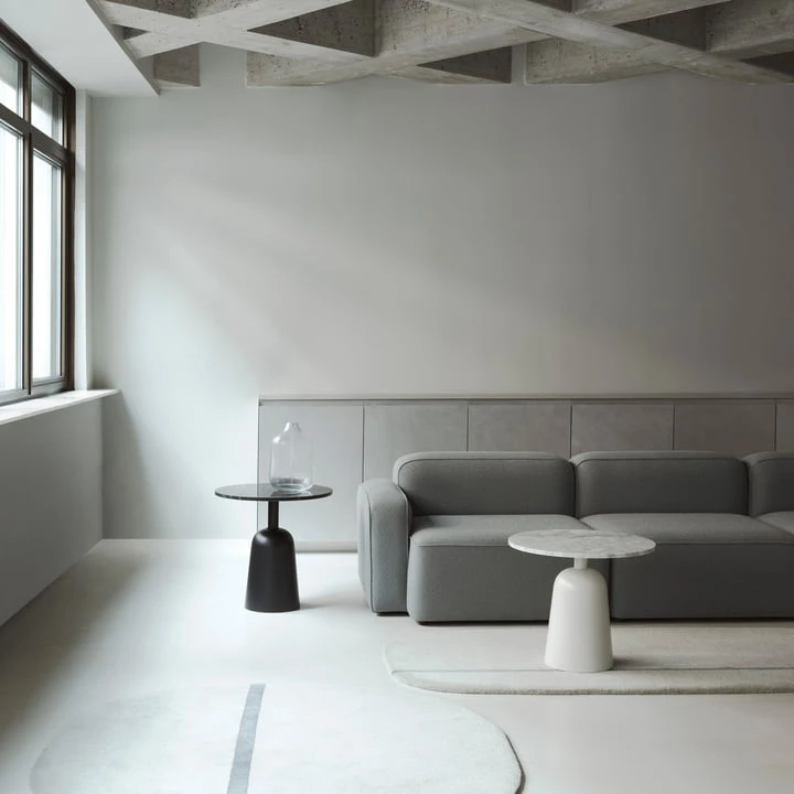 The Turn Coffee table by Simon Legald for Normann Copenhagen is a small but highly functional table made of wood and steel. The name Turn refers to the rotating movement used to adjust the height of the round tabletop. Effortlessly, it rises in height from its bell-shaped steel base, extending the table from 41.5 cm to 66.5 cm.