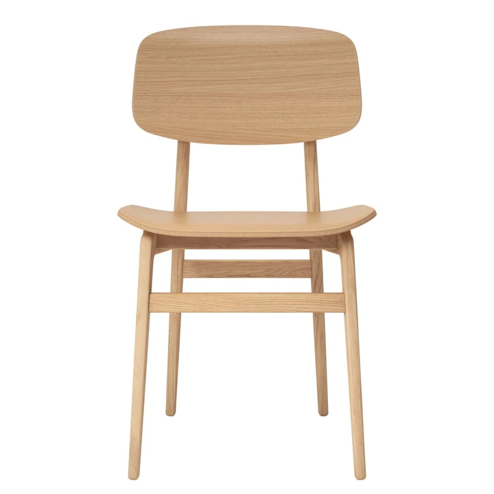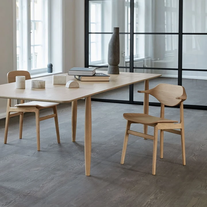 The chair is made of solid oak wood. The seat and backrest are made of laminated oak. The slightly slanted and curved seat provides additional comfort and invites you to linger. Available in various versions and optionally with leather upholstery, the chair blends well into any ambience.