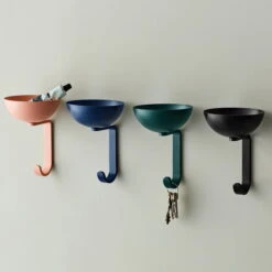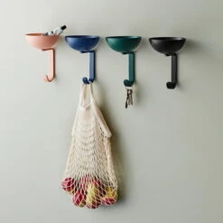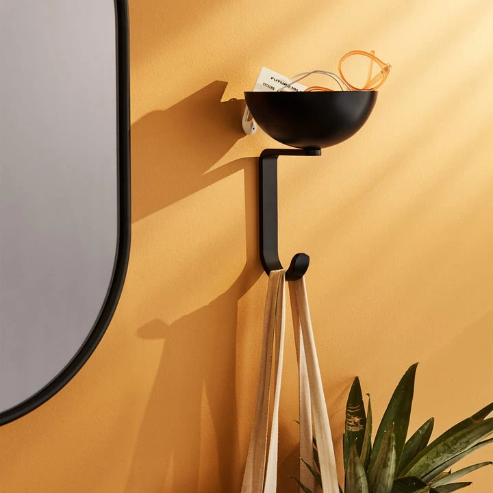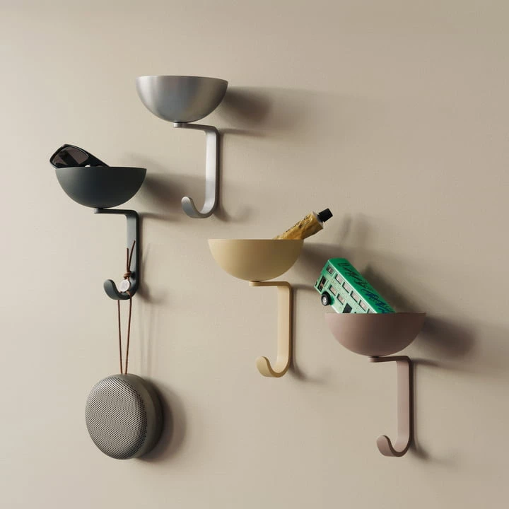 The wall hook made of steel and aluminum is combined with a round bowl – similar to a bird nest – which safely stores objects of all kinds.