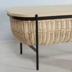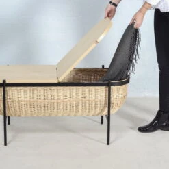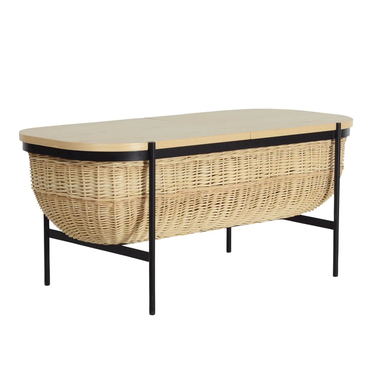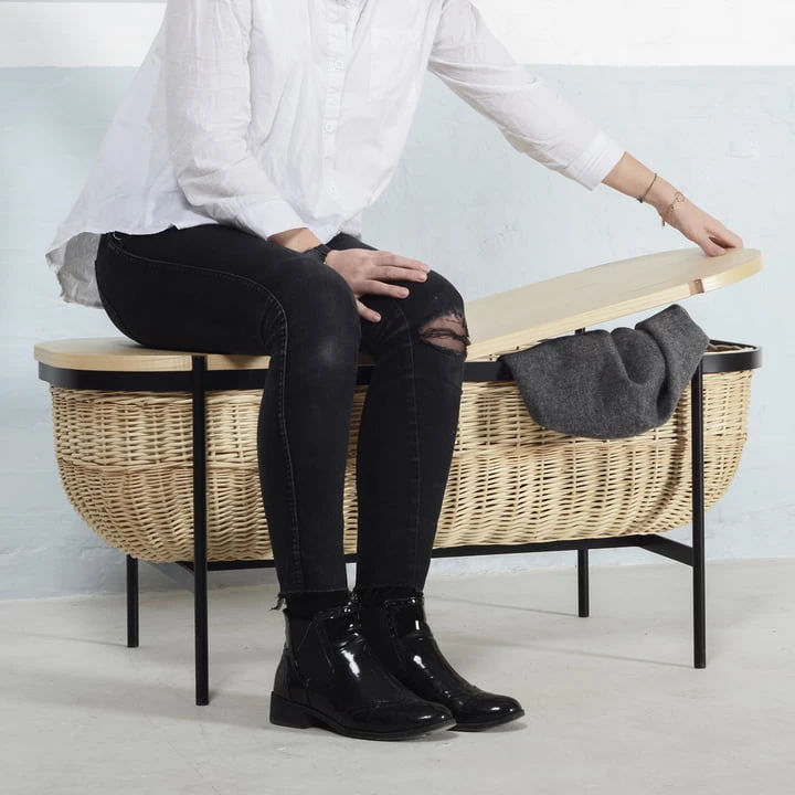 While the frame is made of powder-coated metal, exudes a certain industrial charm and could not be simpler, the body is a real wickerwork: the wicker basket is made in the south-eastern regions of Poland, where basket weaving is still practiced by hand and the conditions for cutting willow are ideal. With an ash veneer lid, the wicker basket can be used as an excellent storage space, for example to store blankets, clothes or toys, and at the same time the wooden top serves as a seat for a short stay.