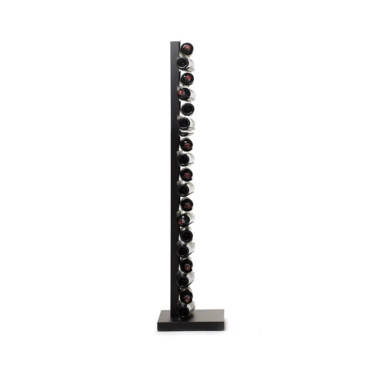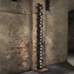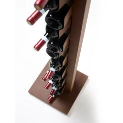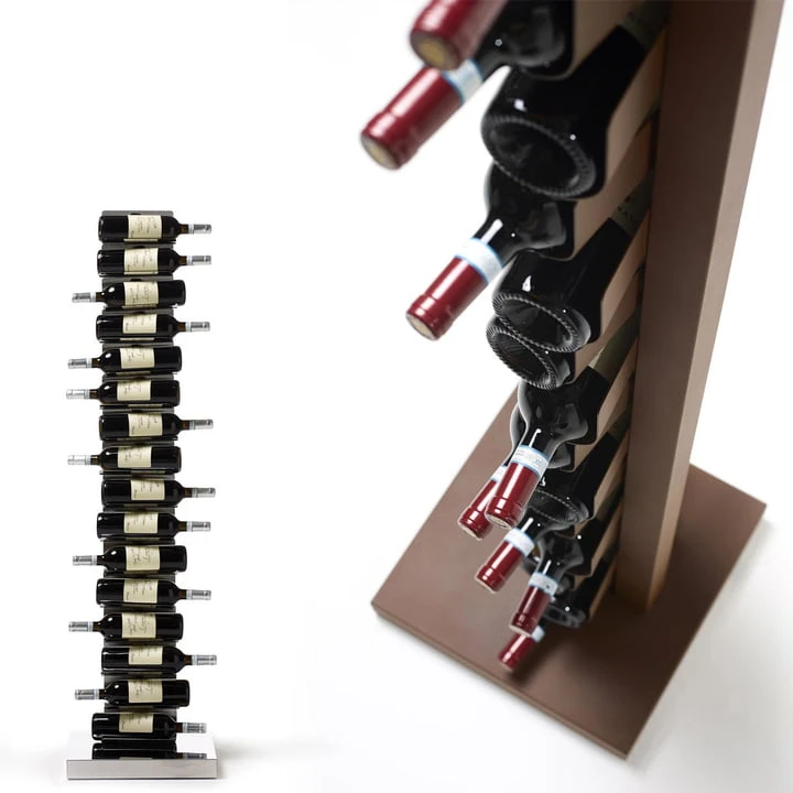 The base of the rack is a metal column connected to a system of slats. The supports are designed to be as unobtrusive as possible to give the viewer the idea of suspended bottles. Slim, noble and extravagant is the design of the wine bottle rack, which fits in the home living area, as well as in bars or hotel lobbies. Freestanding, the shelf can be arranged at any place in the room.