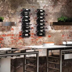 The slender shelf is available in various sizes and can be mounted individually or in groups on the wall as required. The wine rack can be used in the living room at home, in public bars or hotels and convinces with its minimalist design.