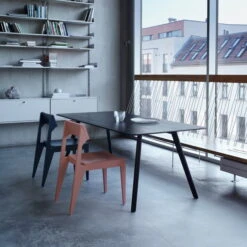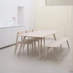 The design is a reinterpretation of a classic chair with a special silhouette. Viewed from the front, the chair Schulz When viewed from the front, the chair still appears quite unspectacular, but when viewed in profile, its edges and graphic appearance come into their own excellently, spreading futuristic charm. At the same time, the clearly visible wood grain sets natural accents makes it clear that traditional materials and modern design do not have to be mutually exclusive. Arranged in several at the dining table, used as a desk chair or placed as an eye-catcher in the hallway, the Schulz Chair for a great Bickfang.