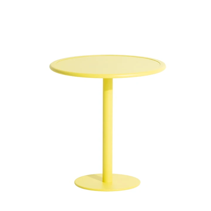 The Week-End bistro table Outdoor from Petite Friture has the look of a classic bistro table, but is designed with even more practicality in mind. Made of aluminum, it is finished with a UV-resistant epoxy coating that resists both water and fading UV rays. In addition, the round table has a slight rim on the table top so that glasses and plates cannot slide off.
