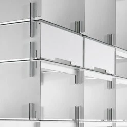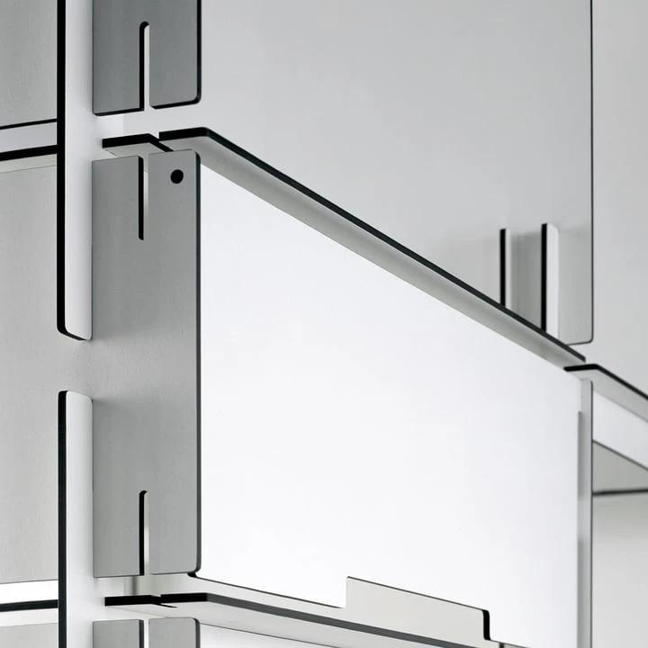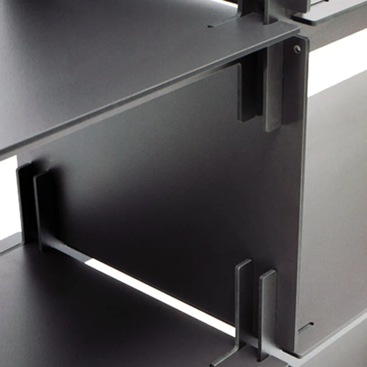 The shelf is composed exclusively of 4mm HPL plates. In spite of the humble material thickness, an extremely high capacity (max. 25 kg per compartment) and stability is attained through the horizontal and vertical reinforcement ribs, based on the construction principle of a T-beam. When finished, a shelf is created which is visually light and delicate while still impressing with its high stability. The name comes from the pre-fab concrete buildings erected in communist East Germany, which similar to this shelving system could be expanded as desired and were easy to assemble.