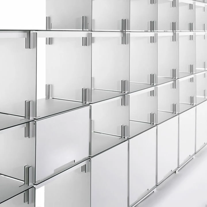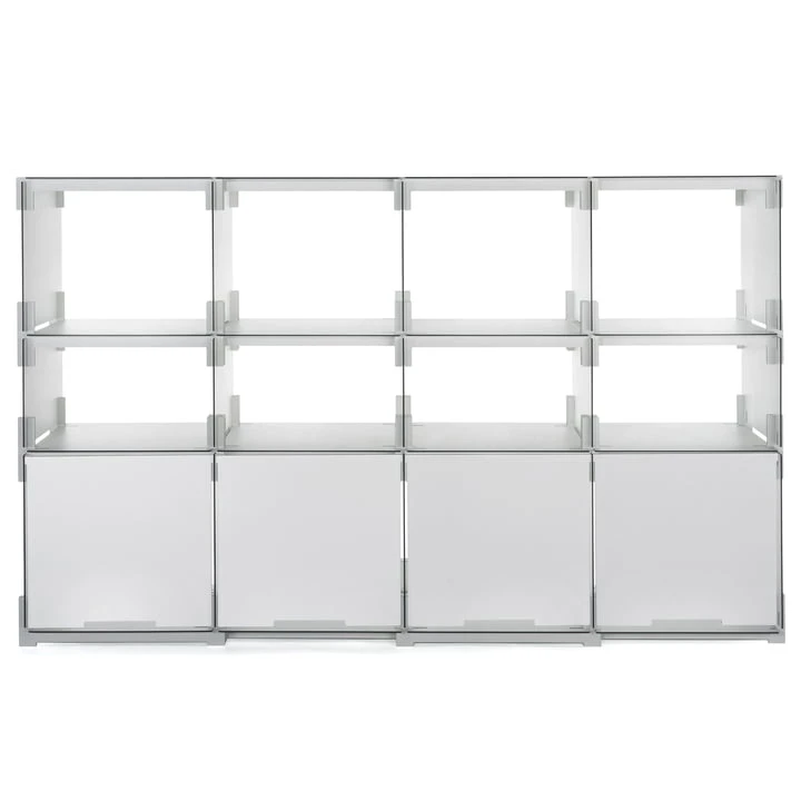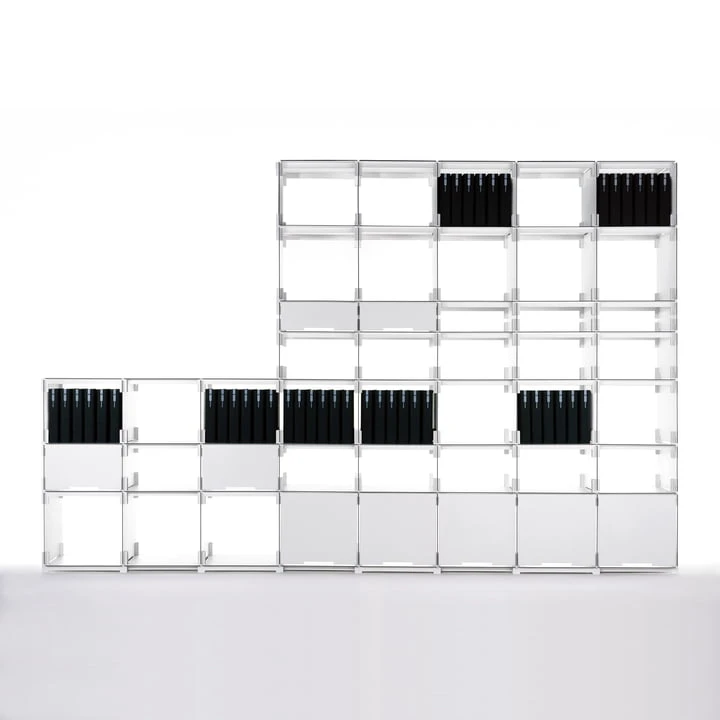 Plattenbau has four different compartment heights: for CDs, paperbacks, folders or picture books. The open compartments can also be closed with hanging doors and the individual elements can be equipped with rear panels if needed.