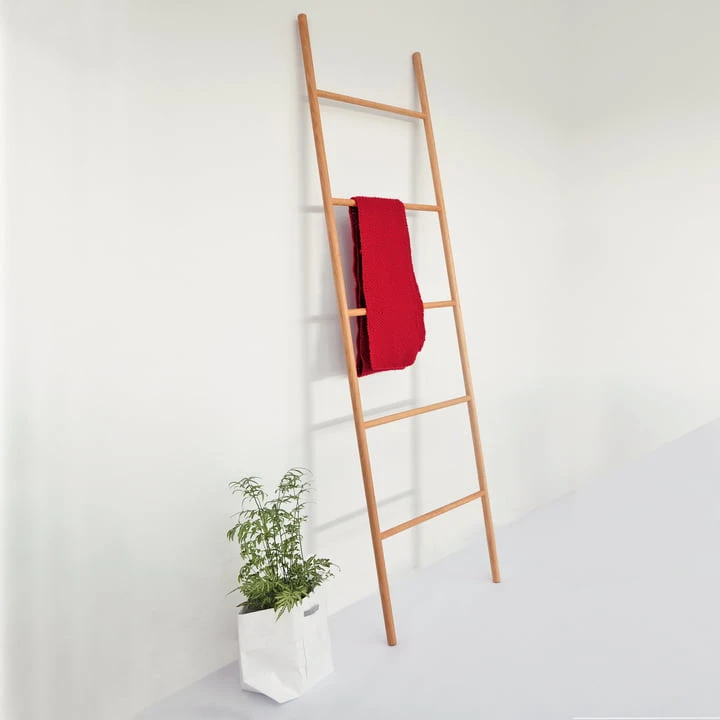 The Raumgestalt storage ladder makes it easy to hang up clothes and other textiles. Used as a mute servant in the bedroom, the outfit can be laid out for the next day, while the ladder in the hallway can serve as a wardrobe for jackets and coats.