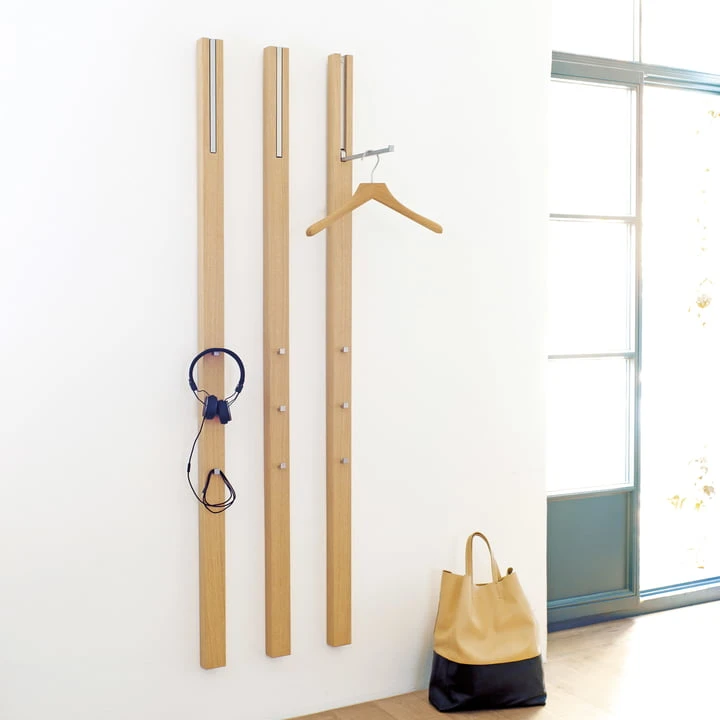 Simple, slim and rich in color. Line embodies reduction to the essentials. The minimalist wall coat rack Line convinces with its functionality as well as with its superior look. The coat rack element accommodates three bag hooks in the middle section, where shoes, bags, scarves, hats or even bags find space.