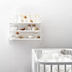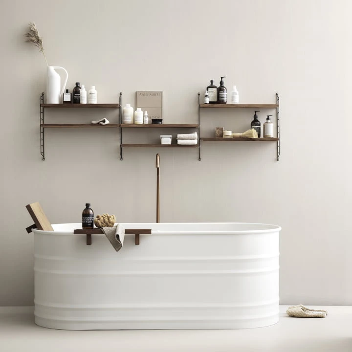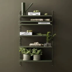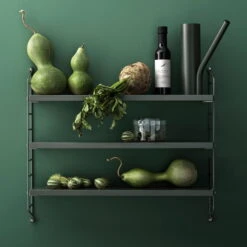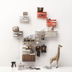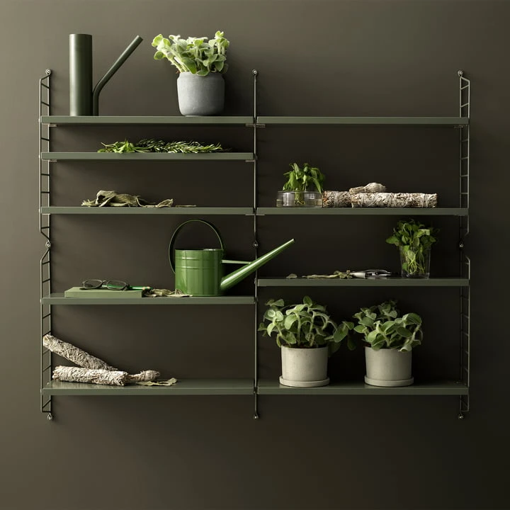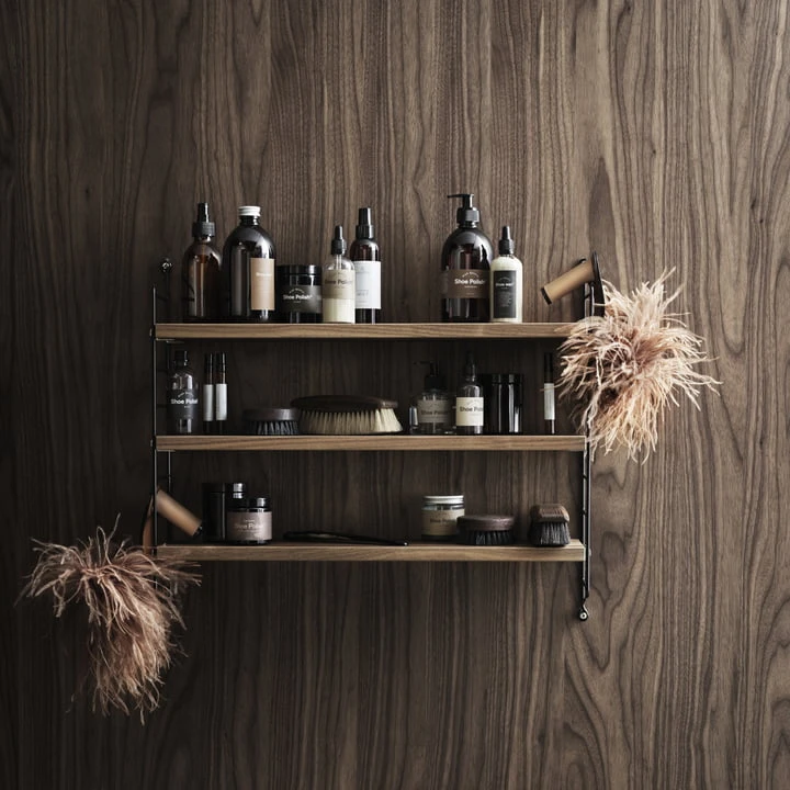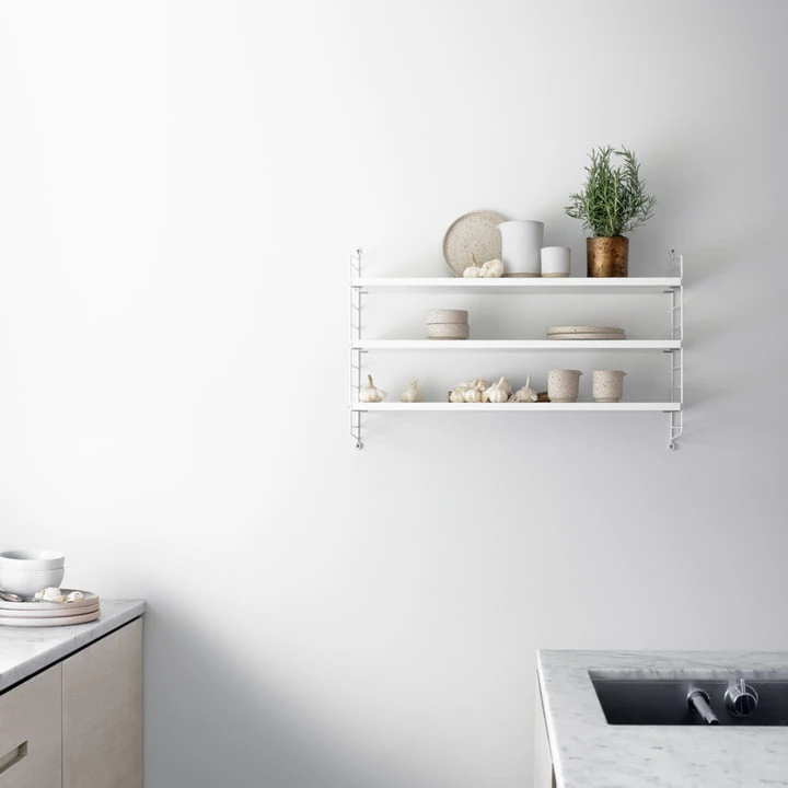 The String Pocket Shelf from Nisse Strinning can be combined with other shelves and can be extended both upwards and sideways. Floor ladders are not available for this shelf. Included are two side elements for wall mounting and three matching shelves.