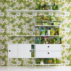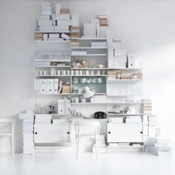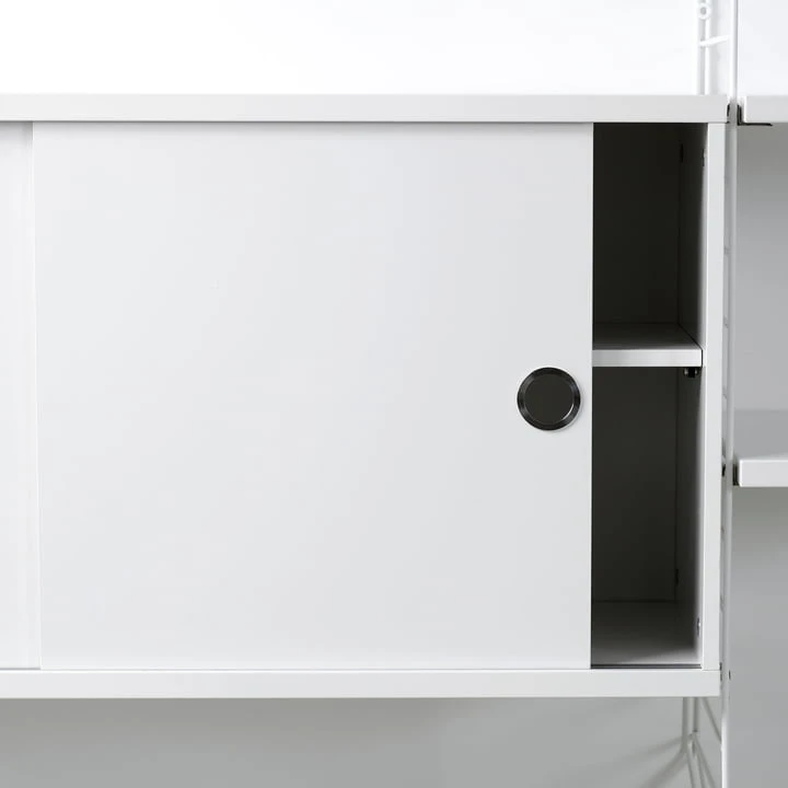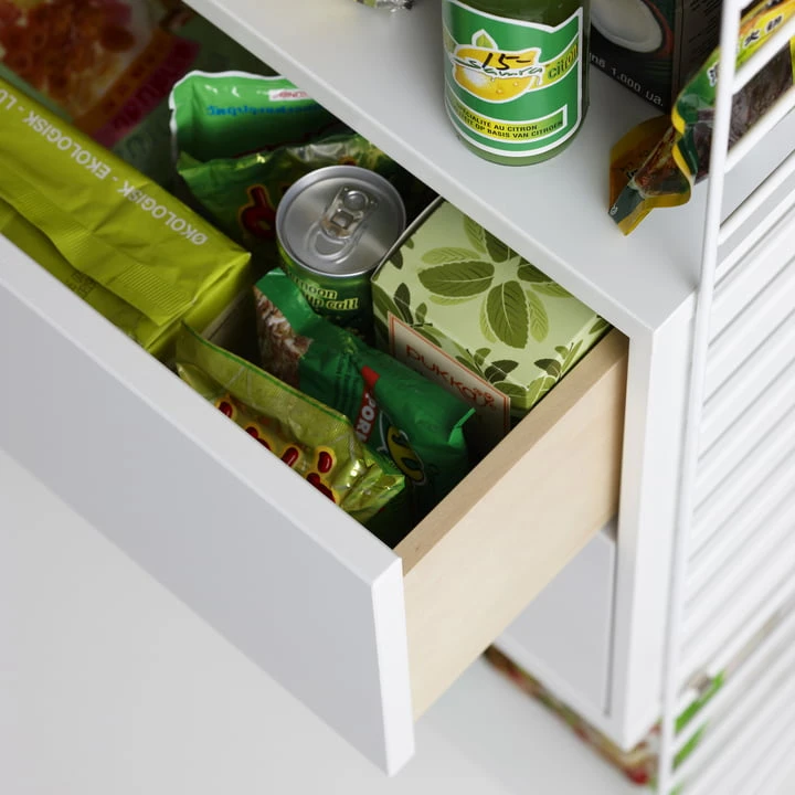 A shelf with drawers for the white String version is available. We can also deliver the wall and floor panels in warm grey.