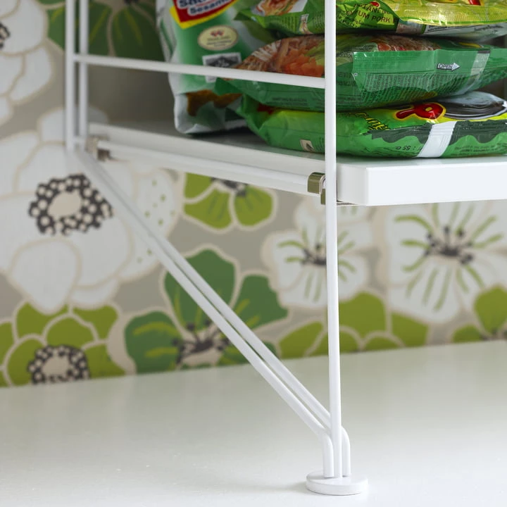 The String wall shelf is available with a depth of 20 and 30 centimetres. For the latter version, in addition to the “wall ladders”, “floor ladders” with stable feet bases can also be ordered in both depths and in two different lengths.