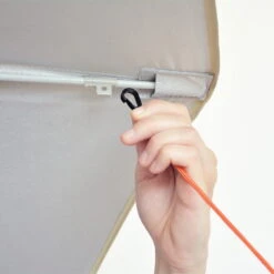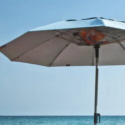 It not only protects against UV radiation, but also has ventilation openings for improved air circulation. Enough storage space for wet swimwear and other small items is provided by the hook hangers and the storage compartment directly under the umbrella. In addition, there is a tilt mechanism on both sides so that its position can be adjusted to the sun’s rays. The T-shaped tips at the ends of the umbrella prevent injuries.