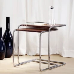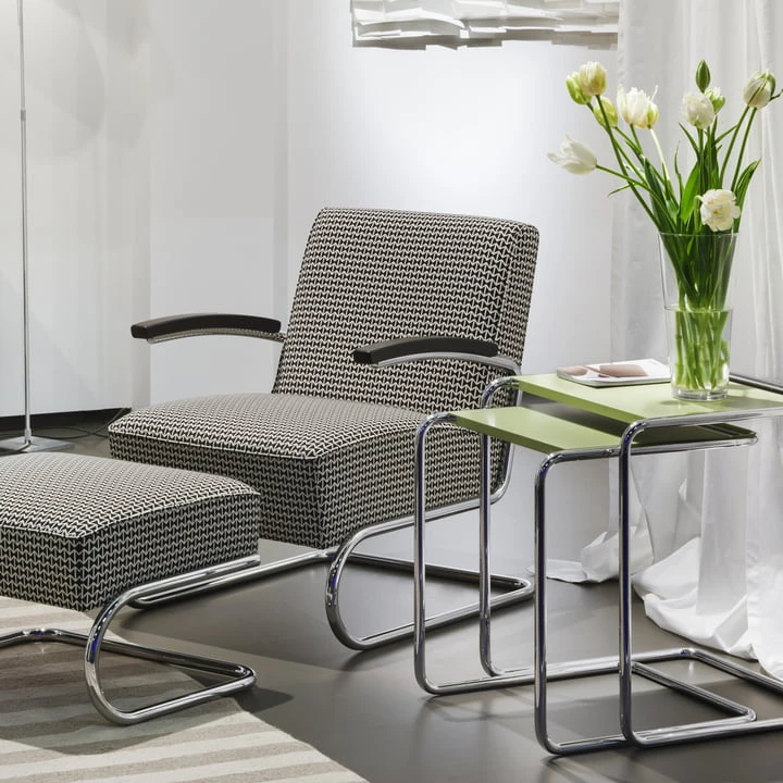 The B 97 table by Marcel Breuer for Thonet was designed as early as 1933 and is today one of the classics among tubular steel furniture. The design inspired not only by the innovative material use of tubular steel, but also by the extremely practical form, which allows the table – thanks to the open side – to be pulled to the armchair, bed or sofa.