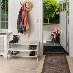 The stand-shoe rack is available in two sizes, 88 cm wide and accommodating eight pairs of shoes, while the 50 cm wide version is suitable for 4 pairs. The top level serves as a further surface on which additional shoes or other things – such as keys or purses – can be placed.