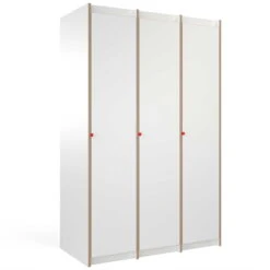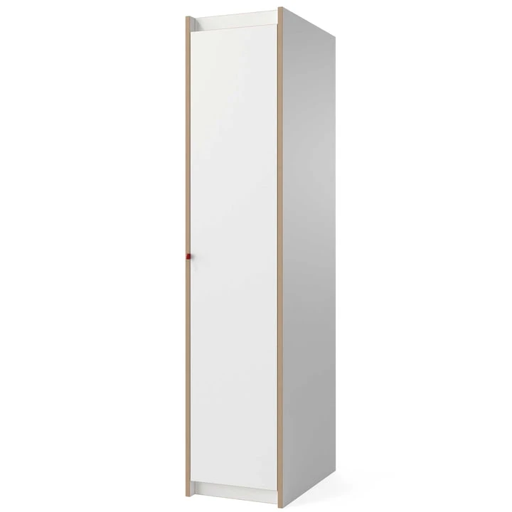 The design never fails to impress: The cupboard consists of coated, white MDF, which contributes to its clean look. Visual highlights such as the visible MDF edges and the handles made of red PP straps instantly add character to the overall piece. Thanks to its simple, timeless design, the cupboard is suitable for the hallway, the children’s bedroom or as a classic wardrobe in the bedroom.