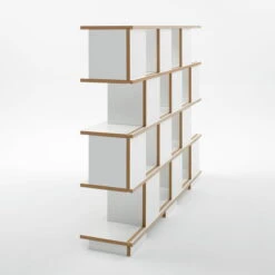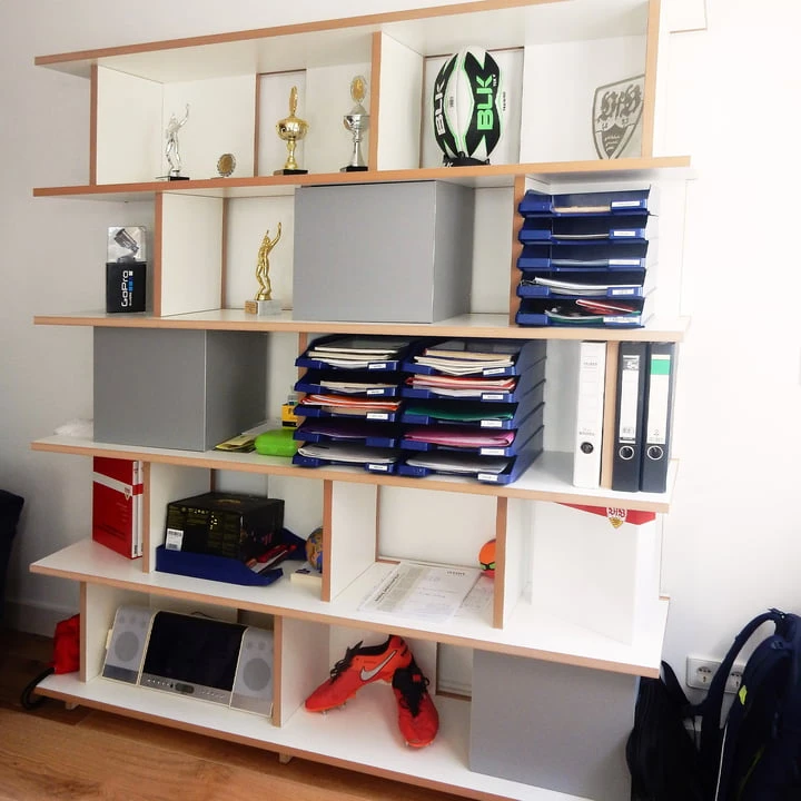 The stell shelving system consists of basic and add-on modules. A basic module consists of three foot sections, an intermediate shelf, three brackets and a lid. An add-on module consists of three angles and an intermediate shelf. The base and angle elements are simply placed inside each other. If the shelf is extended, the lid of the basic module simply moves upwards. The angles can be moved afterwards.
