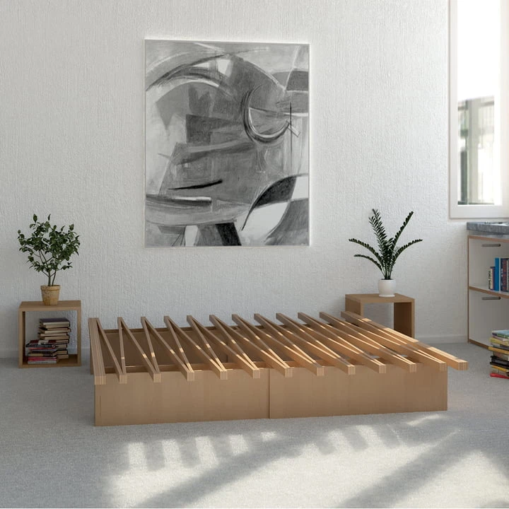 The v bed by Tojo is award-winning: in 2002 it was awarded the international design prize of the Design Center Stuttgart. Similar to a drawer system, the substructure is brought to the right size just as quickly: the two elements are pulled apart and then wedged together. Suitable for mattresses of 180x200cm.