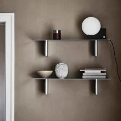 The long, gently rounded rectangular shelf and the smaller, rounded shelf are available in either black anodised aluminium and oiled walnut or hand polished and waxed aluminium. Hanging alone but especially together, the wall shelves are both practical and space-saving and decorative. Books, vases, tins and much more find a nice place on the shelves.