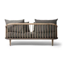 The frame of the backrest consists of numerous wooden slats, whose organic shape and special construction create a reference to traditional craftsmanship. Due to the noble rear view the sofa can also be placed free-standing in the room without any problems. Made of smoked oak, the sofa frame has a natural look, which is given a modern touch by the generous cushions.