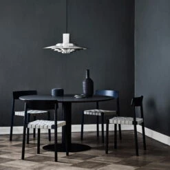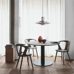The black, powder-coated, cylindrical metal table leg carries a circular top, which is available in oak wood. The result is a versatile and modern table that offers plenty of space for friends and family. Its round shape invites you to socialize. Available in different versions and sizes, the round dining table blends in perfectly with various room situations and living styles.
