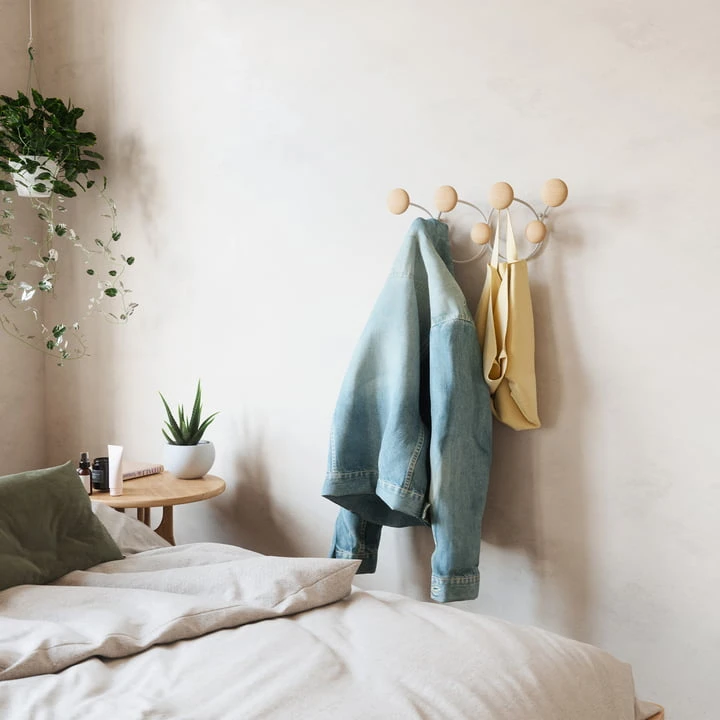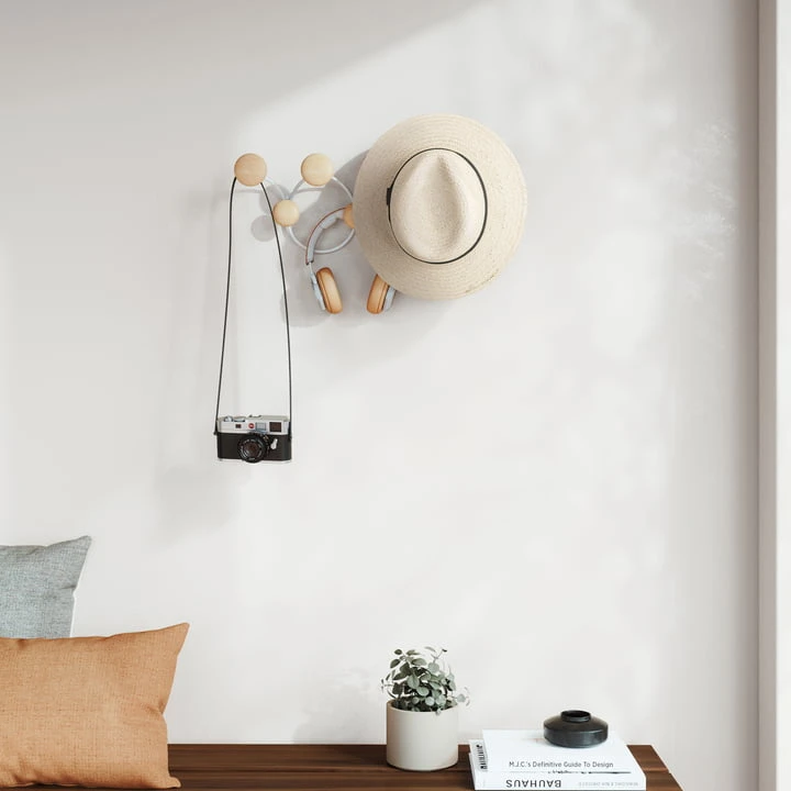 With its playful, round shapes and a sophisticated mix of wood and metal, the Dotsy Wall coat rack from Umbra with 7 hooks is a functional and decorative addition to any wall. The coat rack is easy to attach and adorns any wall. Additionally, it offers plenty of space for jackets, bags, hats and more. Each hook supports up to 2.3 kg, Dotsy is attached to only 2 screws, which minimizes wall damage.